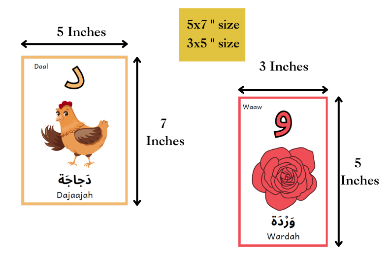 - A4 PDF files with 28 Arabic Alphabet Flashcards 3x5" (4 per page)